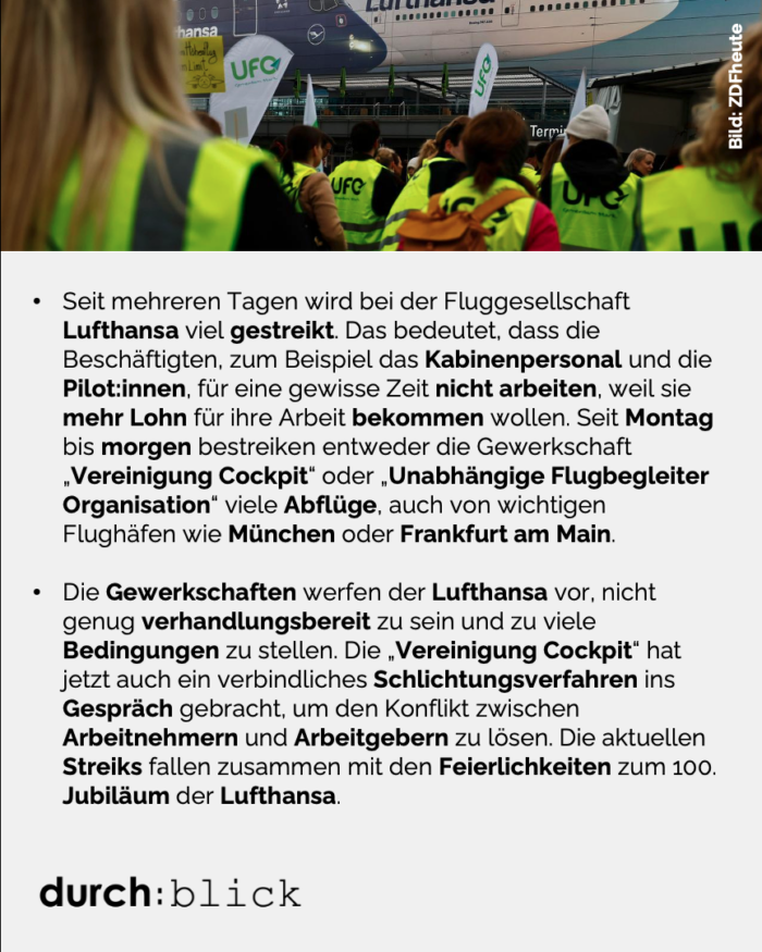 Seit mehreren Tagen wird bei der Fluggesellschaft Lufthansa viel gestreikt. Das bedeutet, dass die Beschäftigten, zum Beispiel das Kabinenpersonal und die Pilot:innen, für eine gewisse Zeit nicht arbeiten, weil sie mehr Lohn für ihre Arbeit bekommen wollen. Seit Montag bis morgen bestreiken entweder die Gewerkschaft „Vereinigung Cockpit“ oder „Unabhängige Flugbegleiter Organisation“ viele Abflüge, auch von wichtigen Flughäfen wie München oder Frankfurt am Main.