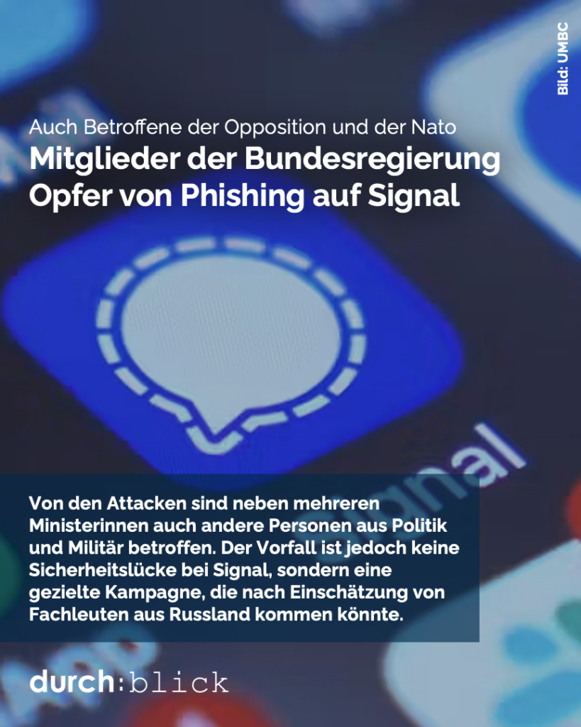 Von den Attacken sind neben mehreren Ministerinnen auch andere Personen aus Politik und Militär betroffen. Der Vorfall ist jedoch keine Sicherheitslücke bei Signal, sondern eine gezielte Kampagne, die nach Einschätzung von Fachleuten aus Russland kommen könnte.